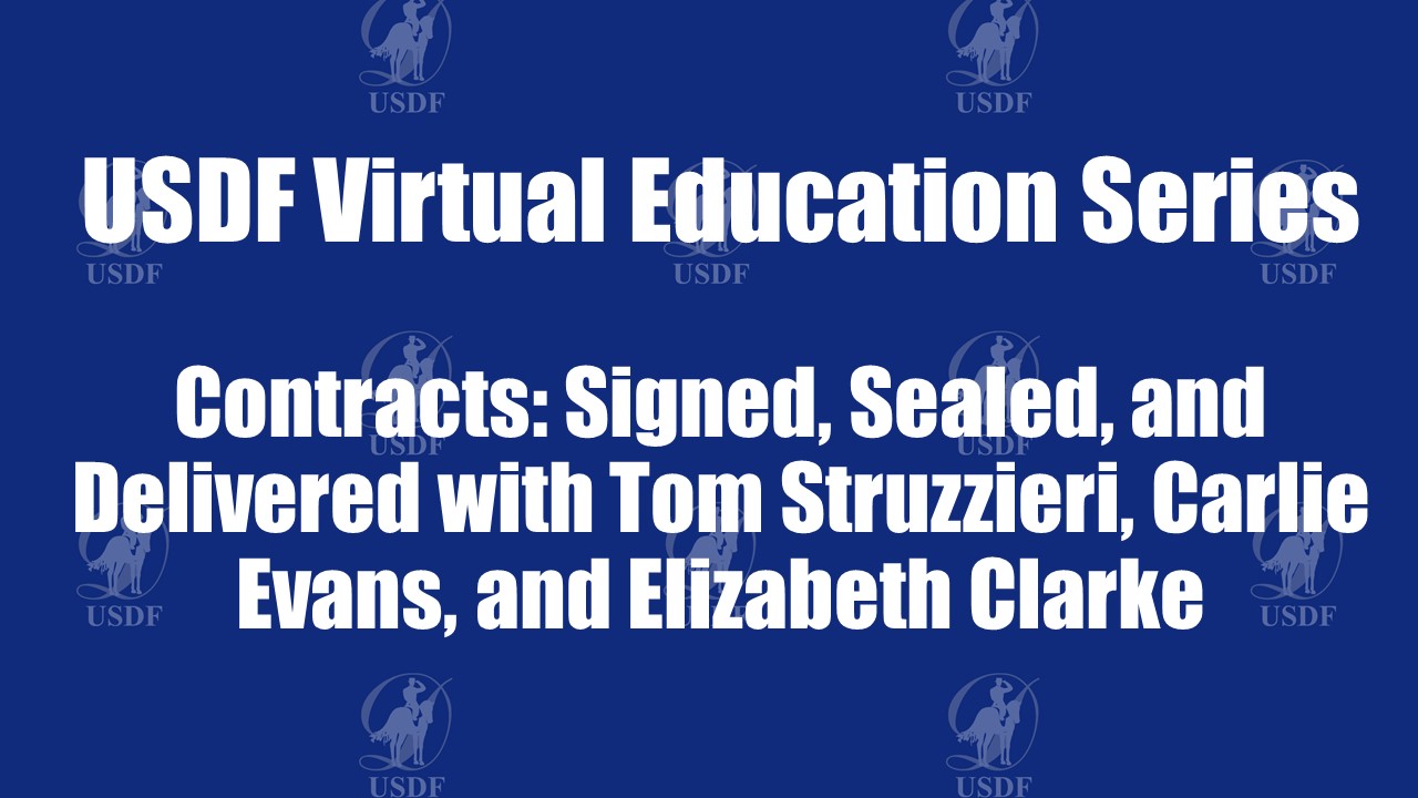 Join USDF for this virtual webinar on drafting and negotiating contracts for Dressage competitions. Carlie Evans and Tom Struzzieri will discuss the differences between private and publicly owned show facilities and how this may impact key areas of the facility contract. Elizabeth Clarke will discuss contracts between show management and officials and show staff including independent contractors and workers compensation.